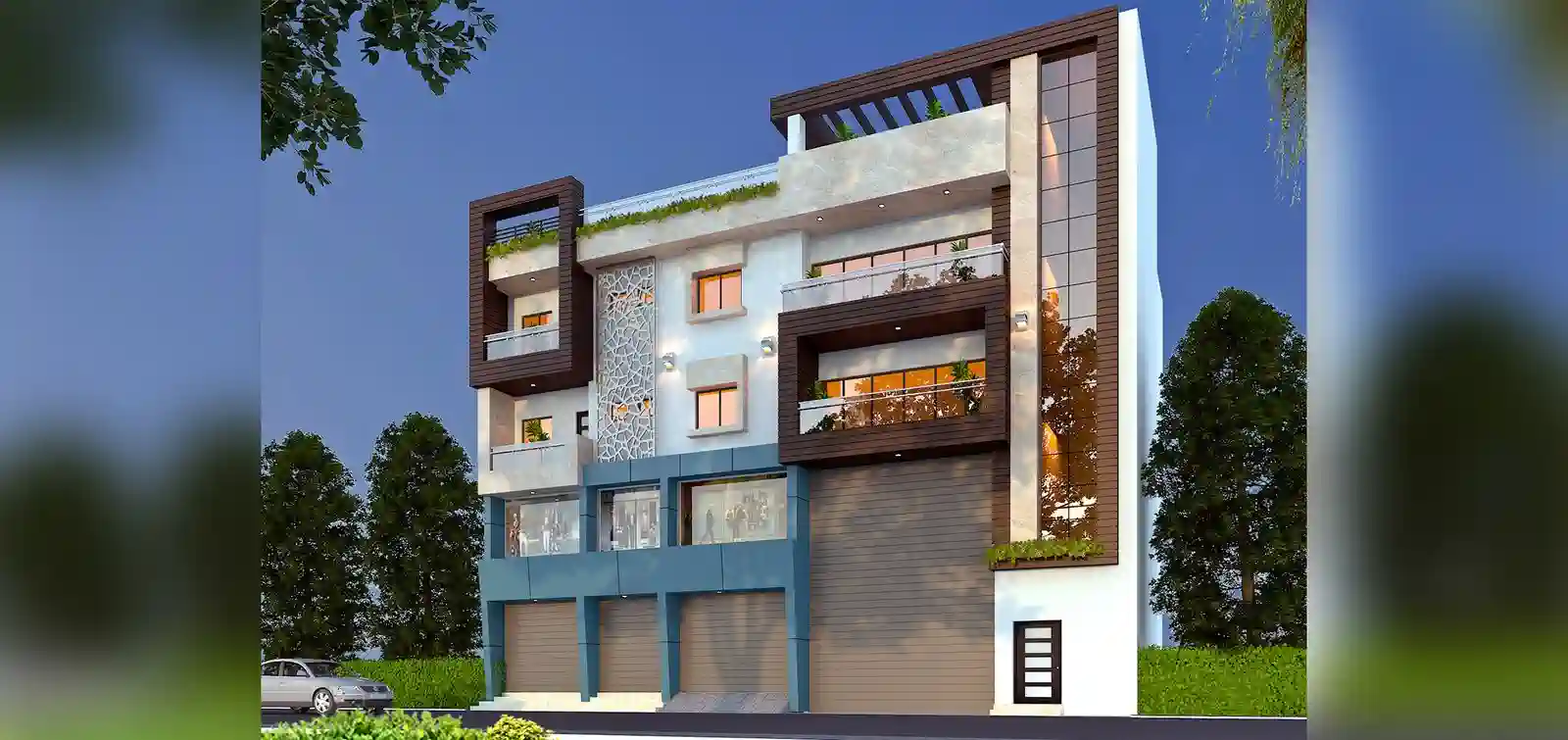 A mixed-use building designed with a modern elevation and a total built-up area of 7680 sq. ft. The project is under construction, with quality and delivery standards prioritised throughout execution.
