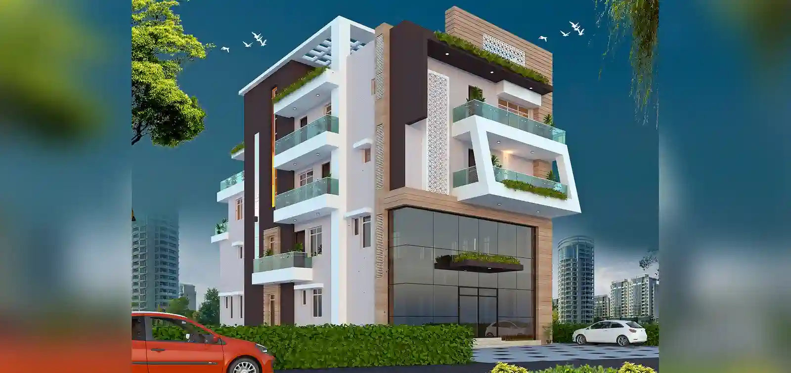 A four-storey eye hospital built on a 10,664 sq. ft. super built-up area. The design emphasises premium finishes and glasswork, enhancing both functionality and regional visual appeal.